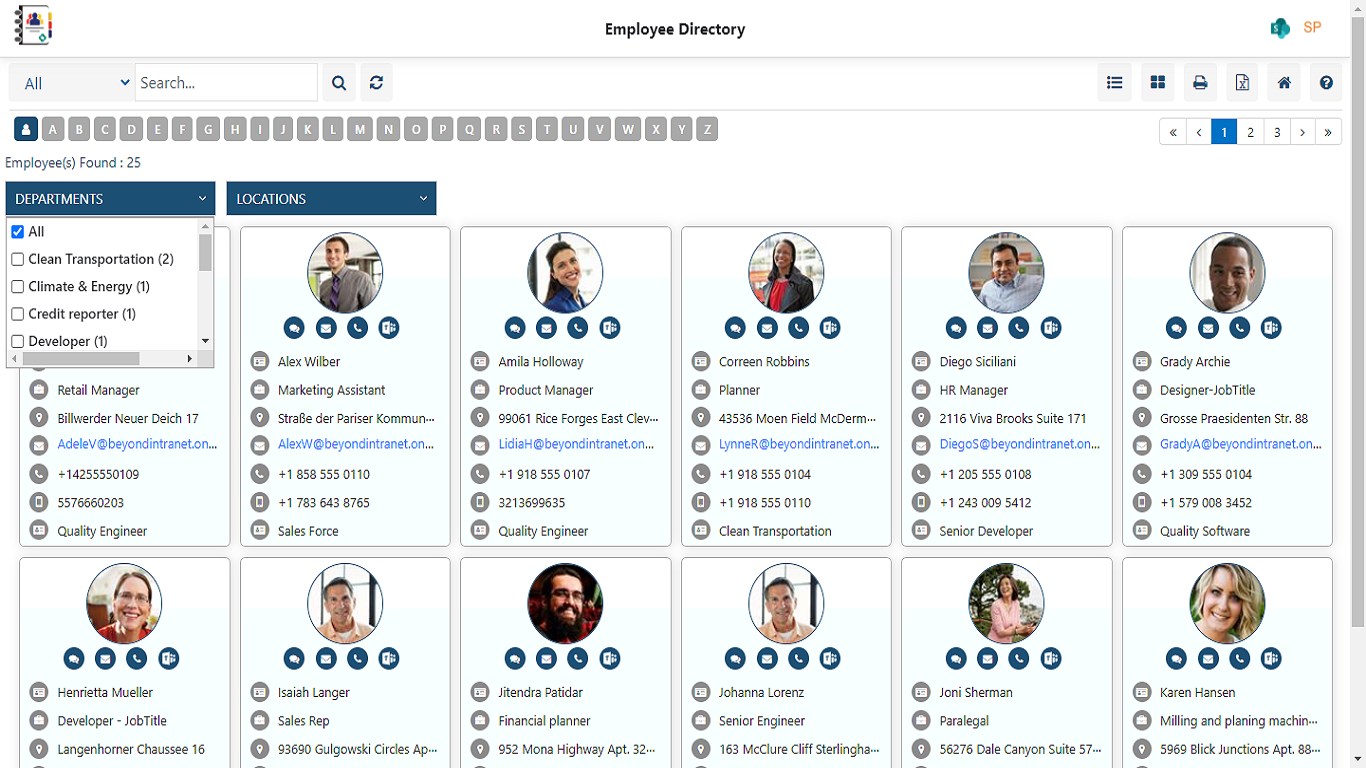 The SharePoint Company Directory can be integrated with MS Teams and other emailing applications. With the latest SharePoint Framework (SPFx) Employee Directory loads in seconds, no matter your employee database size.